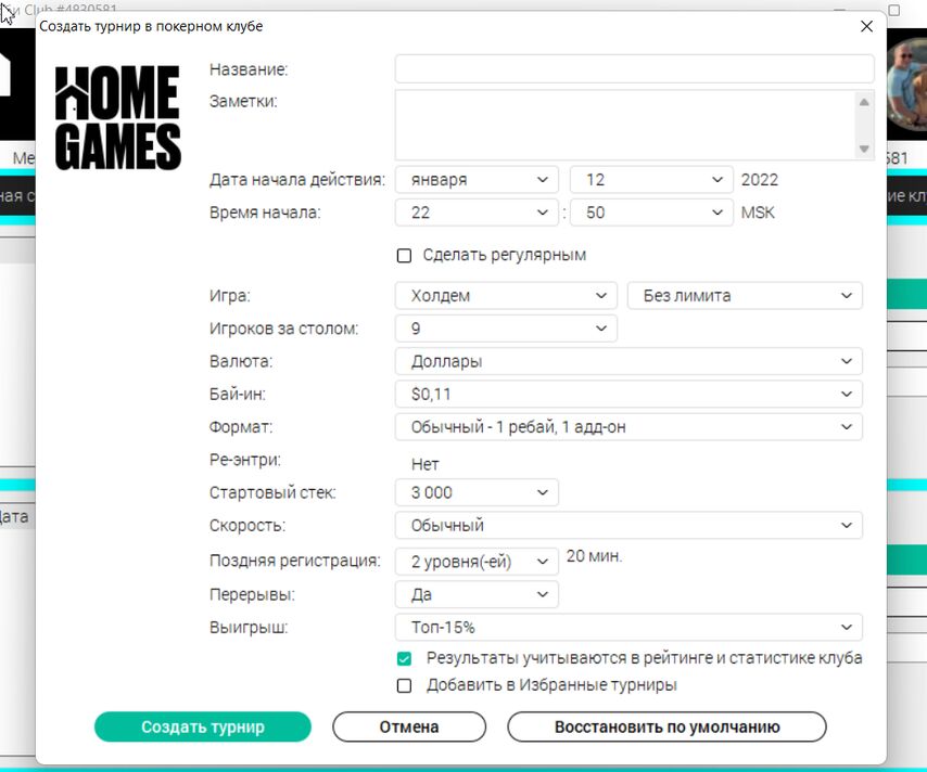 Home Games переводится на русский как «домашние игры». Сервис позволяет создать собственный маленький рум со входом по приглашениям. В глобальном лобби пользователь противостоит соперникам со всего мира. В хоум геймс пул можно определить самостоятельно.