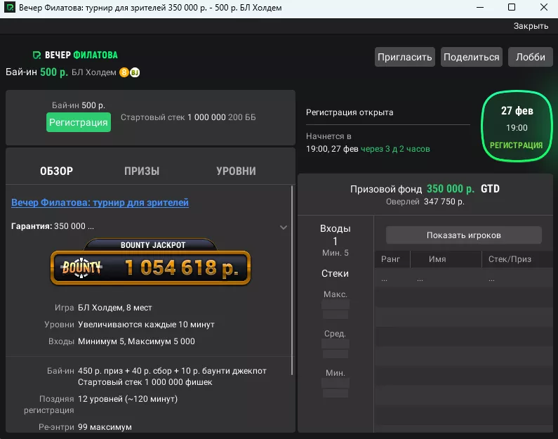27 февраля в 19:00 по Москве состоится покерное шоу «Вечер Филатова: битва стримеров», в котором популярные стримеры сразятся в прямом эфире за призовой фонд в 4,000,000.