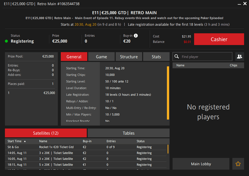 | вс, 20 августа | 20:30 | E11|€25,000 GTD| Retro Main | €20 |
