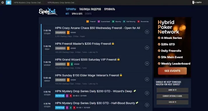На октябрь 2025 года рум предлагает только турниры по безлимитному техасскому холдему. В лобби нет ни MTT по другим видам покера, ни кэш-игр. В течение дня SpinBet проводит от 10 до 15 турниров. Список форматов включает: Freezeout, Satellite, PKO, Re-entries. Бай-ины от $0,55 до $44. В крупнейшем регулярном MTT разыгрывают $450. Почти все турниры проходят с оверлеем. Например, в MTT c гарантией $200 и бай-ином $5.5 участвовали 13 человек.