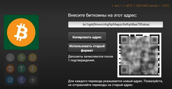Для финансовых операций используется исключительно Bitcoin. При депозите в криптовалюте рум всегда предоставляет новый адрес. Минимальная сумма — 0.01 μBTC, то есть менее 1 цента США.