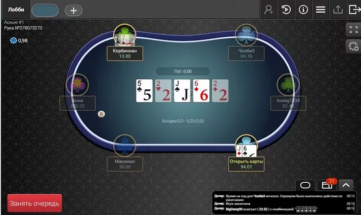 Играют в формате от 6-макс до 9-макс, в лобби встречаются столы хедз-ап. Блайнды начинаются от 0.01/0.02 и достигают 5К/10К (в чипах).