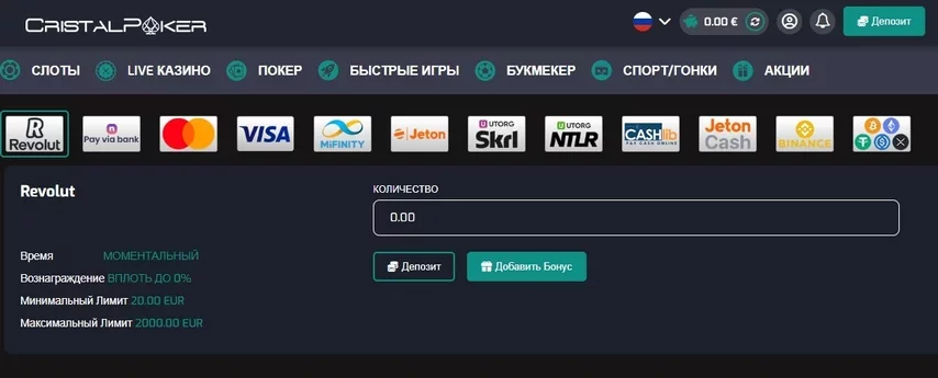 Лимиты депозита: €20 минимум, €2,000 максимум за операцию. Дополнительных сборов при зачислении средств нет. Список платежных методов: Visa, Mastercard, Skrill, Neteller, Jeton, MiFinity, Revolut, Cashlib, криптовалюты, биржа Binance, банковский перевод.