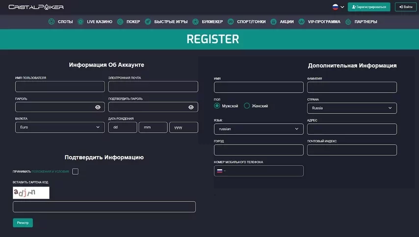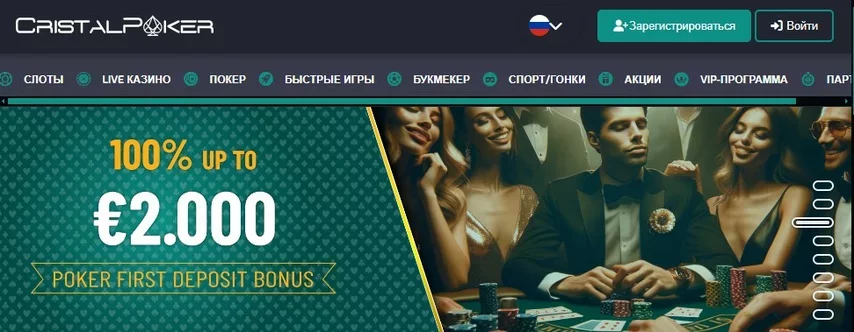 Рум Cristal Poker принимает игроков из 100+ стран, в том числе из России, Украины, СНГ и всего Евросоюза. Не смогут пройти регистрацию жители США, Великобритании, большинства латиноамериканских стран. Ограничение по возрасту — 18 лет.
