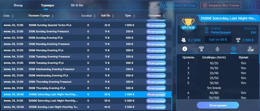 Минимальные турнирные бай-ины: €1.10 во фризаутах и €0.11 в случае формата «ребай + эдд-он». Максимальный взнос — €55. Такой турнир проходит каждую субботу. Гарантия — €2,500.