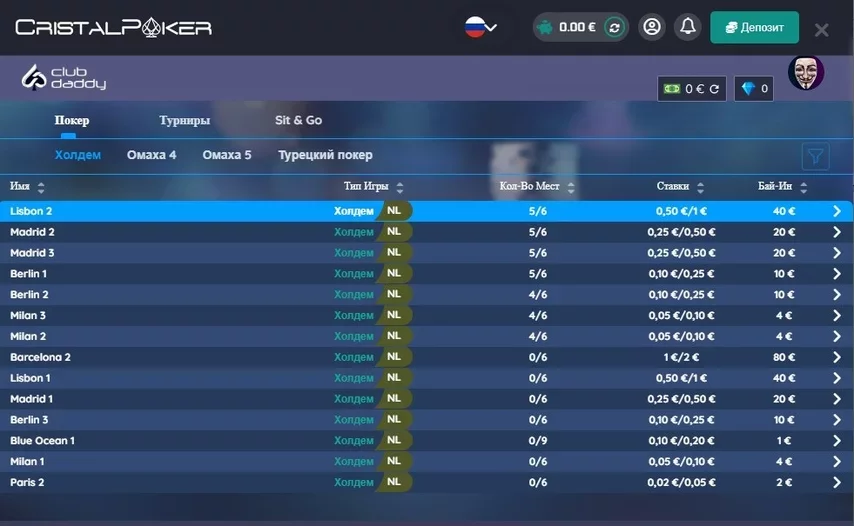 На сайте Cristal Poker можно сыграть в казино. У покерного раздела есть собственный бренд — Club Daddy.