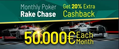 Регулярная акция — ежемесячная рейк-гонка с призовым фондом €50,000. Регистрация не требуется. Все игроки принимают участие автоматически. Приз — возврат 20% рейка.